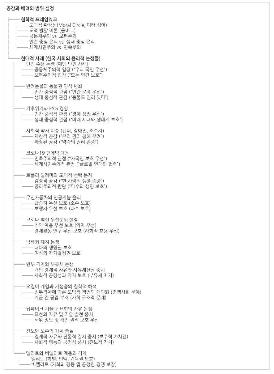 공감의 경계: 우리는 누구까지 돌보고 연대할 것인가?우리 인간은 누구에게까지 공감하고 배려하며, 보호해야 한다고 느낄까요? 가족과 친구 같은 가까운 사람들만? 아니면 보이지 않는 먼 나라의 사람들까지도? 길가의 강아지 한 마리, 멸종 위기의 고래, 혹은 미래 세대에까지 우리의 도덕적 책임이 미칠까요? 인간이 공감하고 배려하며 보호해야 할 대상의 범위는 어떻게 설정되는가라는 질문은 우리의 도덕적 상상력과 한계를 시험합니다. 이 질문에 답하기 위해 우리는 철학적 개념들을 살펴보고, 한국 사회의 현실 사례들을 통해 공감의 범위가 어떻게 논의되고 있는지 알아보겠습니다.철학적 프레임: 공감과 도덕적 범위에 대한 관점도덕적 확장성 이론 (피터 싱어): 철학자 피터 싱어는 저서 *「확대되는 원(The Expandin..