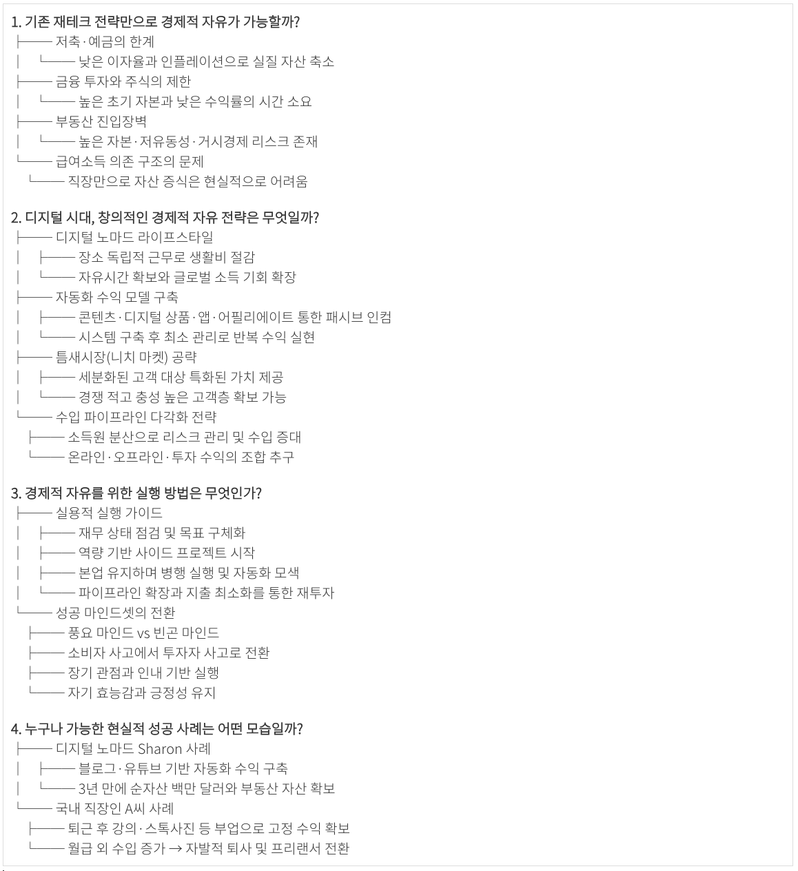 결국 핵심은 회사나 남에게 고용되어 월급만 받는 구조에서 탈피하여 **나만의 “돈 찍어내는 기계”**를 여러 대 만드는 것입니다. 이렇게 파이프라인을 구축해 월급 이상의 수익이 발생하게 되면 비로소 회사에 얽매이지 않고 자유로운 삶을 선택할 수 있게 됩니다.