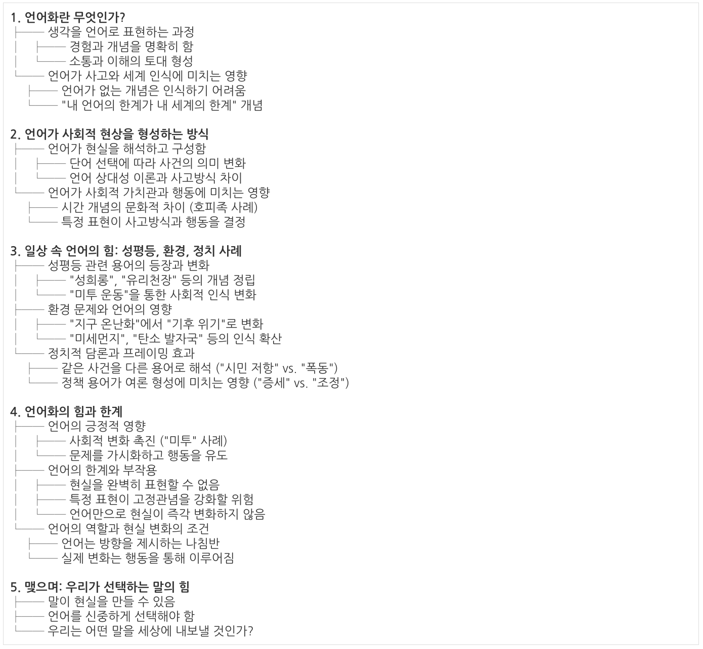 마지막으로, 언어만으로 세상이 저절로 바뀌는 것은 아닙니다. 말은 시작일 뿐, 거기에 담긴 의미를 행동으로 옮기는 일은 또 별개의 과제입니다. 가령 기업들이 상품 설명에 *“친환경”*이라는 말을 붙인다고 해서 실제 환경 문제가 바로 해결되는 건 아니죠. 혹은 우리가 일상에서 쓰는 차별적인 표현을 모두 바꿨다고 해도, 마음속 생각이나 구조적인 문제까지 한순간에 사라지는 것은 아닙니다. 언어는 현실을 형성하는 한 요소이지만, 현실 그 자체는 아니기 때문입니다. 결국 현실을 바꾸는 것은 우리의 지속적인 노력과 행동이며, 언어는 그 방향을 잡아주는 나침반 역할을 하는 셈입니다.