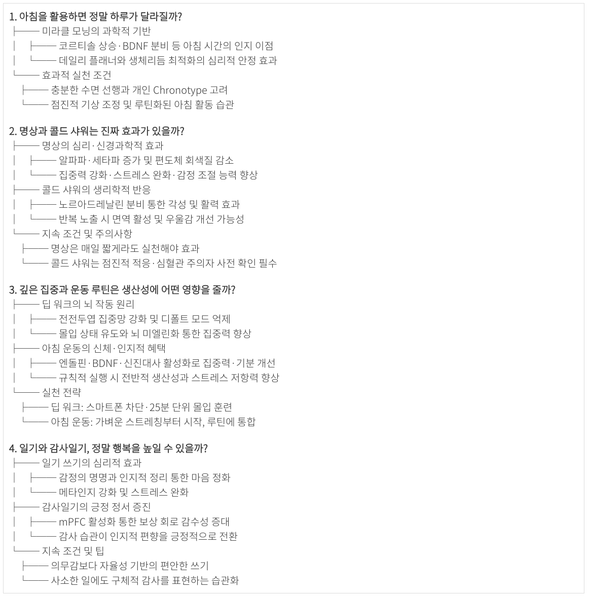 자기계발과 건강 증진을 위해 미라클 모닝, 명상, 콜드 샤워, 딥 워크(Deep Work), 아침 운동, 일기 쓰기 및 감사일기 등이 큰 주목을 받고 있습니다. 이러한 루틴들이 실제로 어떤 과학적 근거를 가지고 효과를 발휘하는지, 심리학·생리학·신경과학적 원리를 알아보고자 합니다. 각 루틴의 효과를 지속하려면 어떤 조건이 필요한지, 일상에서 실천하려면 어떤 팁이 있는지도 함께 살펴보겠습니다.