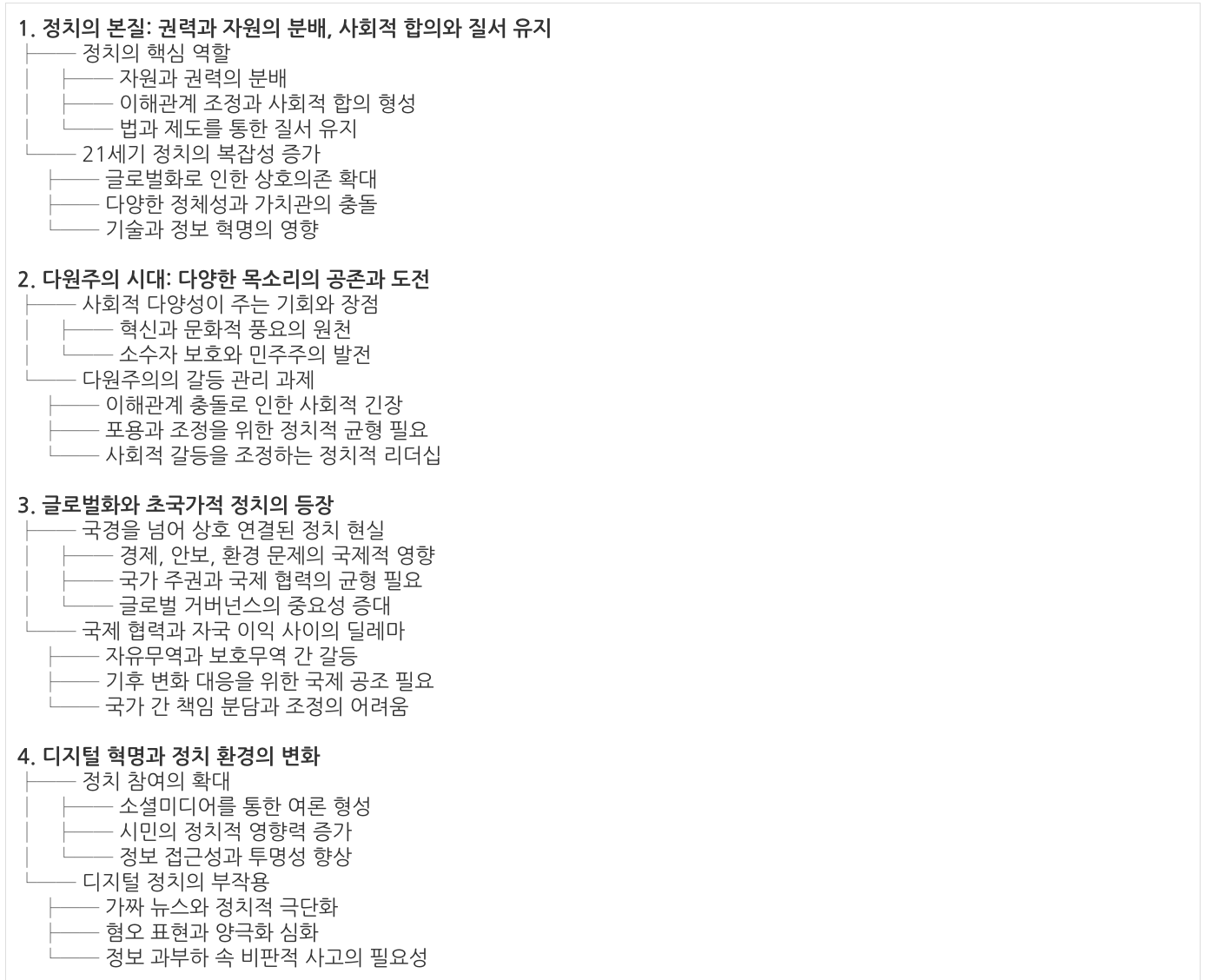 글로벌화 시대의 정치는 딜레마도 안고 있습니다. 국제 사회의 규범과 자국의 이익이 충돌할 때 어떻게 조율할 것인지, 또한 세계 시민의 보편적 가치와 각 지역의 고유한 문화를 어떻게 조화시킬 것인지 등이 과제입니다. 모든 나라가 서로 연결된 현실에서 어느 한 국가도 완전히 고립되어 결정할 수 없기에, 국제 협력과 조정은 선택이 아닌 필수가 되었습니다. 이로 인해 정치 무대는 국내+국제의 이중 무대로 확대되었고, 그만큼 해결해야 할 문제의 복잡성도 증가하고 있습니다.